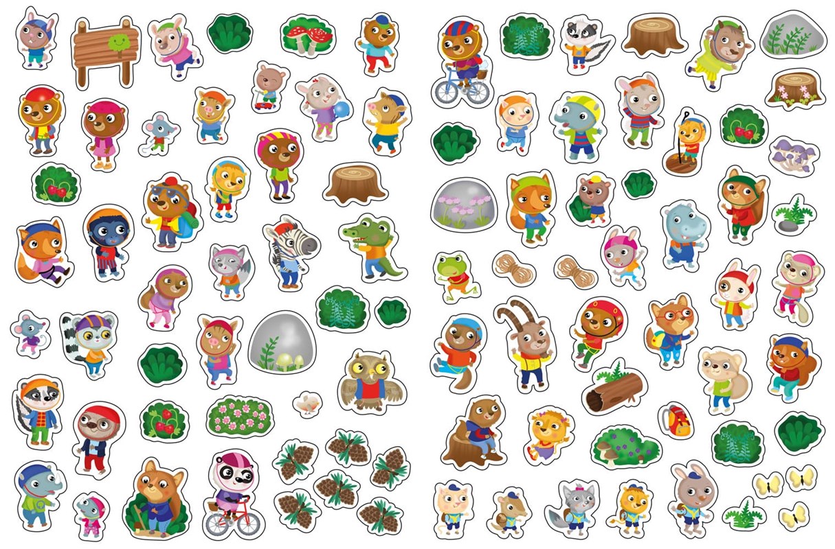 Zábavná kniha plná postav a předmětů, které je třeba hledat. Co se děje na horách, na sněhu, u moře, ve strašidelném domě, v zábavním parku, během kempování, v muzeu, v divadle a doma? Na konci knihy se nacházejí odpovědi hledaných předmětů. Knížka kromě 90 nálepek také obsahuje veselé obrázky pro vymalování.
