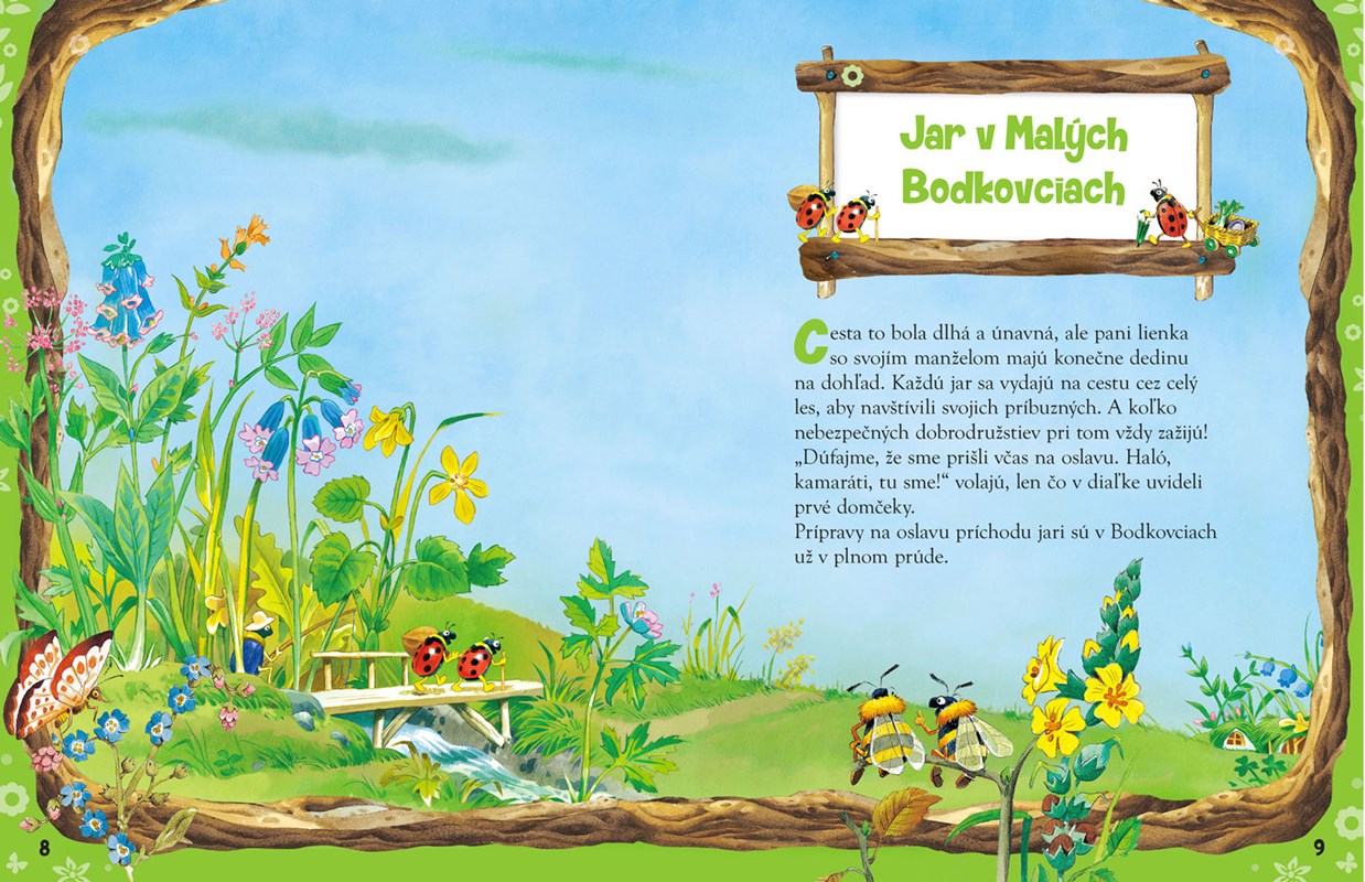 Navštívte na jar Malé Bodkovce s jej rozkošnými obyvateľmi, lienkami, ktoré nepretržito upratujú a chystajú večernú slávnosť. Možno započujete aj krásny spev vtáčikov - konkurz do speváckeho zboru. Bobry chystajú na leto bazén pre všetkých lesných kamarátov, kde sa budú konať známe plavecké preteky. Ako odmenu si môžu dať mňamkový lekvár z černíc, malín a čučoriedok, ktorý pripravia šikovné myšky. Za ušami sa zalizujú aj mravčekovia. Nakuknite do ich útulného mraveniska, prejdite sa na lesné trhovisko cestou posypanou jesenným lístím a ochutnajte jablkový džús tatka ježka i dobroty cukrárky sovy. Keď panuje zima, krtko si užíva pohodlie v útulnom domčeku čítajúc si v kresle knihu, zajačiky si pochutnávajú v teplučkom brlohu na torte a medvedíky sa spúšťajú na sánkach užívajúc si sneh plnými dúškami! Nahliadnite do tejto knižky, kde milé príbehy sprevádzajú nádherné ilustrácie Tonyho Wolfa.
