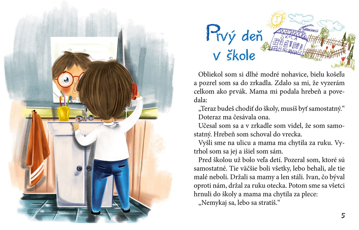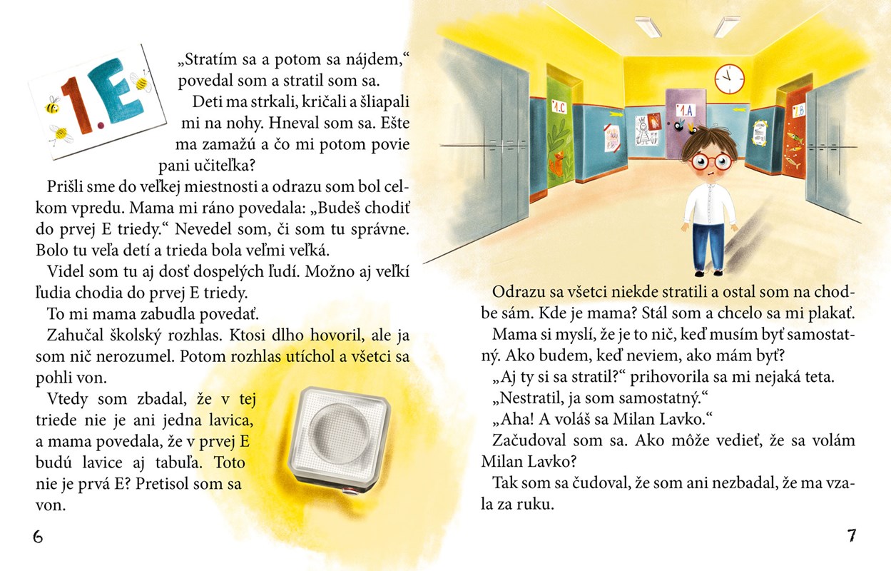 Kniha vyšla v roku 1961 spod pera autorky detskej tvorby Eleonóry Gašparovej a dnes prichádza s upraveným textom pre súčasných prváčikov, zažívajúcich radosti i starosti z nástupu do prvej triedy. Je obohatená o krásne ilustrácie mladej slovenskej ilustrátorky. Knižka predkladá príbehy prváčika Milana Lavka z 1. E triedy, ktorý v škole zažíva mnohé veselé dobrodružstvá - chytanie včielky, čítanie zo šlabikára, prvé priateľstvá, kreslenie pani učiteľky, zoznámenie sa so staršími žiakmi, prekvapenie na Mikuláša, vysvedčenie či školský výlet. Zážitky sú vyrozprávané z pohľadu hlavného hrdinu, vďaka čomu sa s ním budú vedieť prváčikovia lepšie stotožniť.