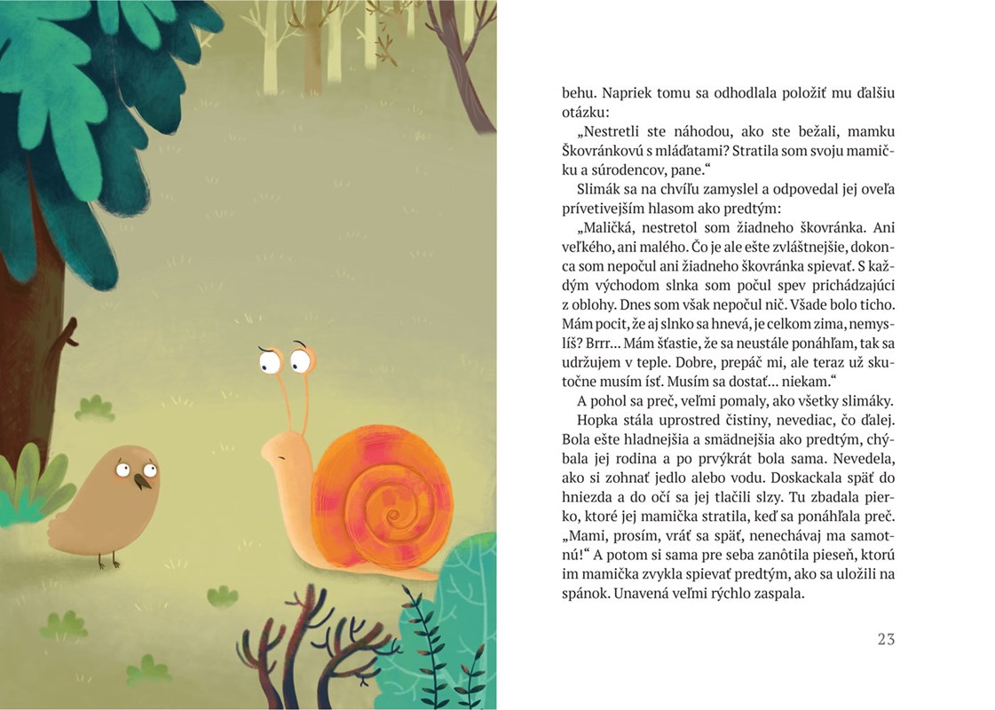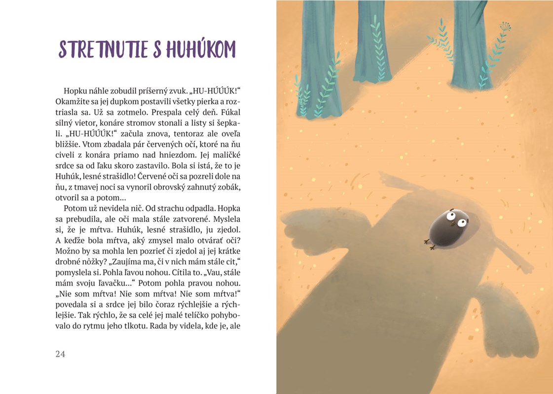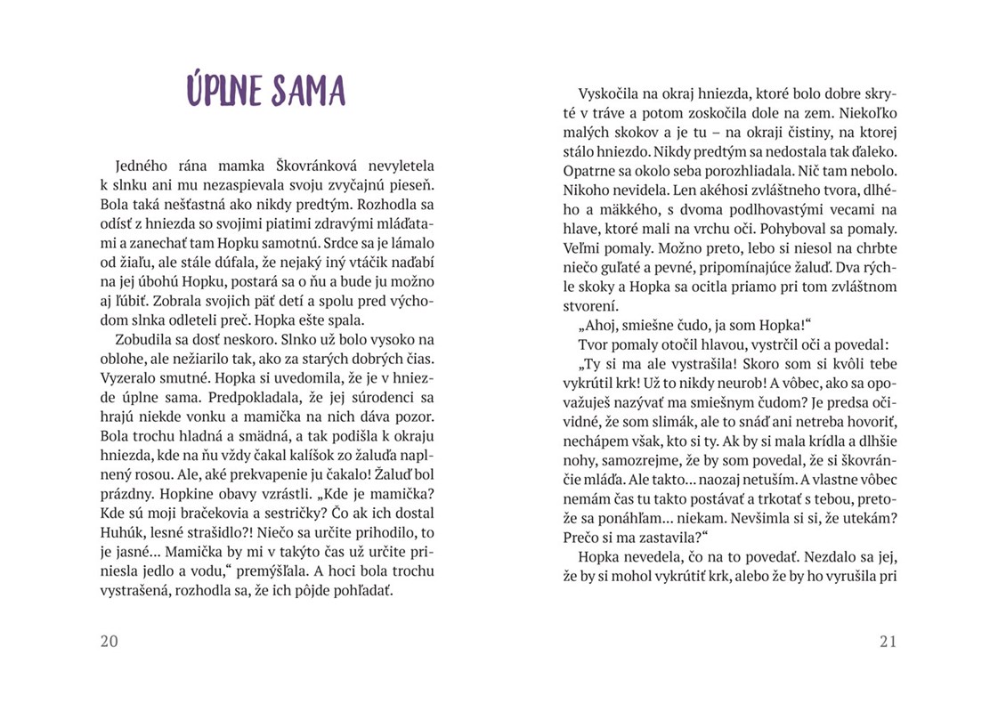 Odvaha nezávisí od veľkosti tvojho tela, ale od láskavosti tvojho srdca. Toto je poučenie, ktoré dostali lesné tvory, keď, na ich veľké prekvapenie, les zachránilo krátkonohé, bezkrídle mláďa škovránka, rozkošná Hopka. Lesní priatelia spolu zistia, že nemožné je len slovo.