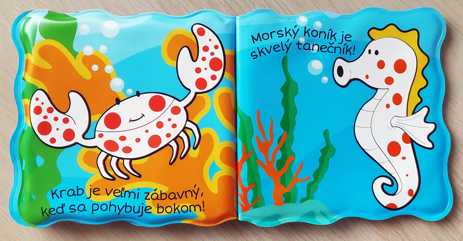 Séria Knižka do kúpeľa prináša deťom zábavu z vyfarbovania zvieratiek vodou! Krokom ku spríjemneniu chvíľ deťom počas kúpania je možnosť zabaviť ich leporelom. Nie však hocijakým, ale takým, ktoré sa rozžiari farbami po styku s vodou alebo so slinami. Alebo stačí pohár s vodou a drobné pršteky môžu kúzliť vodou priamo prechádzaním stranu po strane. O svojich drobcov sa nemusíte báť, pretože dané knižočky majú EÚ certifikát o zdravotnej neškodnosti. Môžu knihu močiť vo vode i olizovať, dokonca aj vtedy na nich spod obrázka vykukne farebné zvieratko. Veselé kúpacie leporelo s morskými živočíchmi, ktoré si môžu vyfarbiť vodou (morská hviezdica, klaun očkatý, štvorzubec, chobotnica, krab, morský koník).