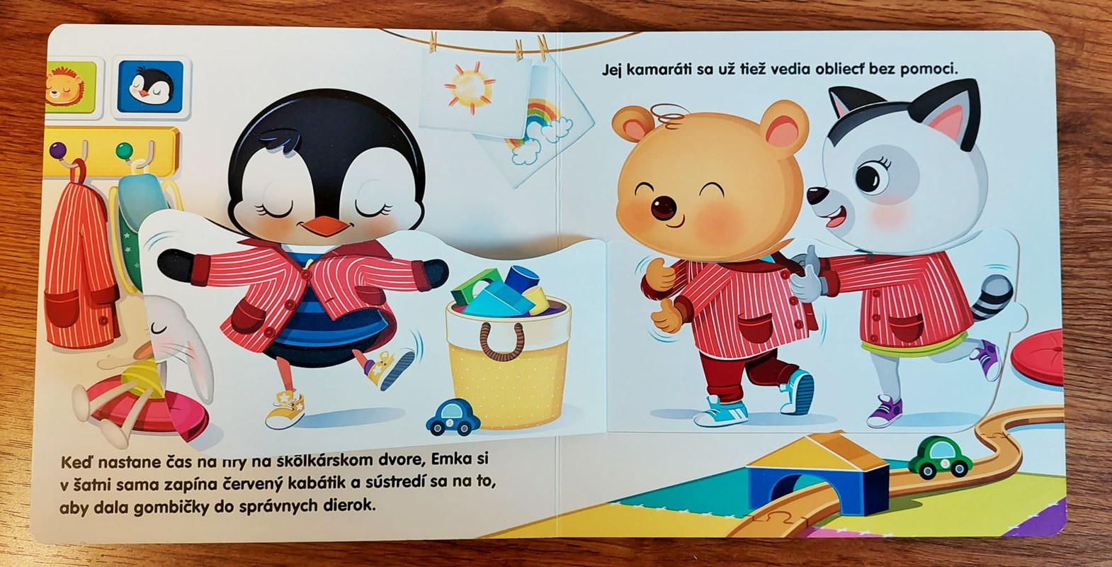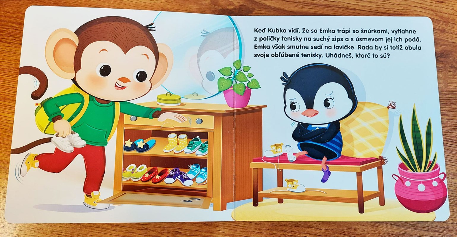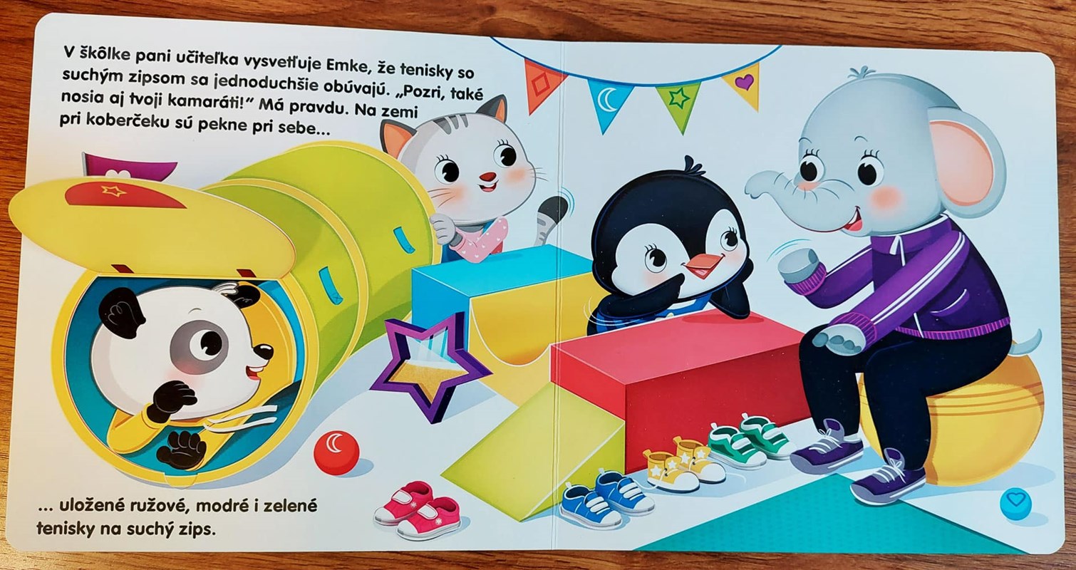 Emka sa učí sama sa obliekať a zaväzovať si šnúrky. Chceš si aj ty obuť svoje obľúbené topánočky so šnúrkami, ale nevieš si ich zaviazať na mašličku? Chceš sa aj ty obliecť bez pomoci? Prinášame vám veselé hravé leporelo s krásnymi ilustráciami a okienkami. Emka a Kubko sú rozkošní kamaráti, ktorí detičky mnohému naučia vďaka veselým príbehom.