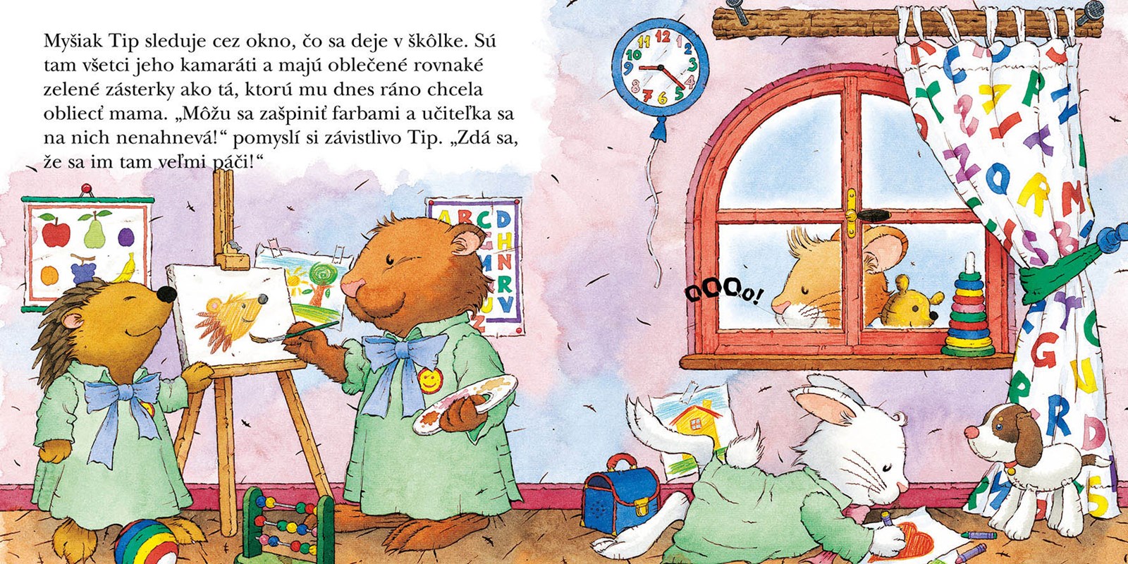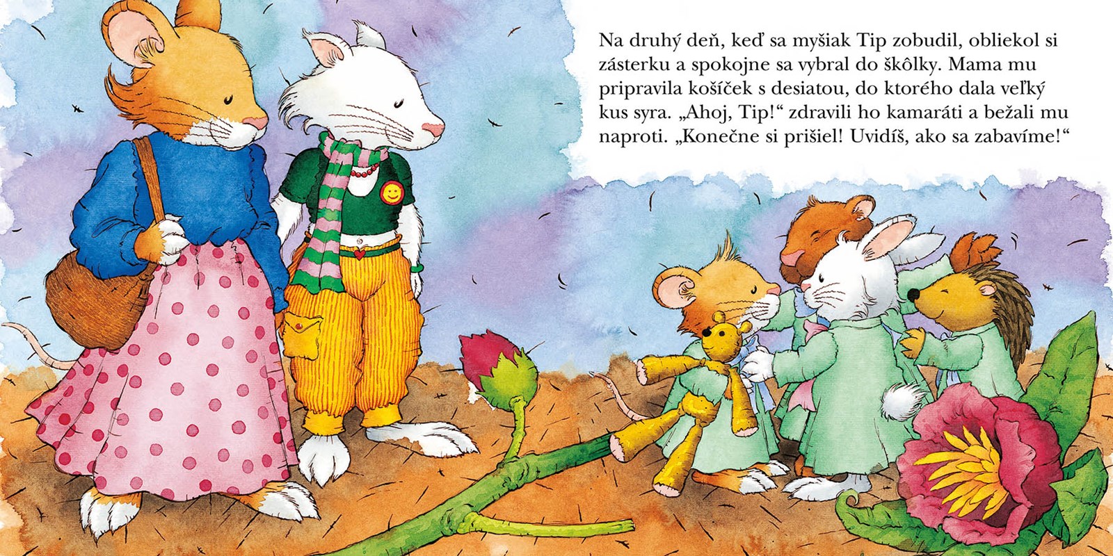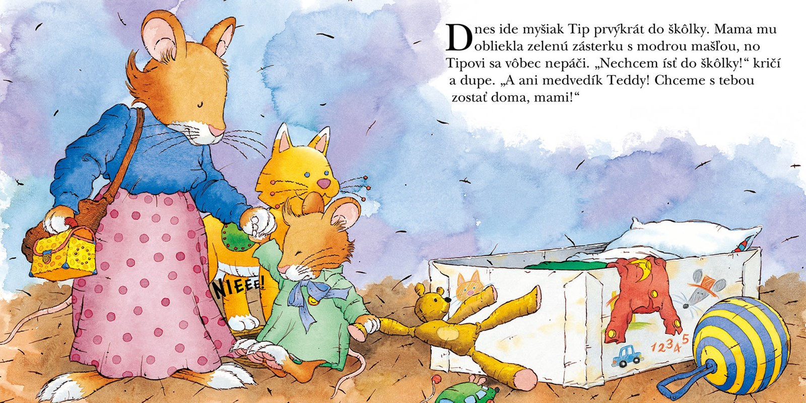 Dostať myšiačika Tipa do škôlky je náročné. Vždy radšej zostane doma a hrá sa sám, pretože jeho mamka má mnoho domácich prác. Počas cesty na nákup s mamkou však zbadá cez okno škôlky, ako sa deti nadšene spolu hrajú. A koľko rôznych hračiek majú! Tak rád by sa k nim pridal aj on! Prvý deň v škôlke tak bude pre myšiačika Tipa výnimočný...
