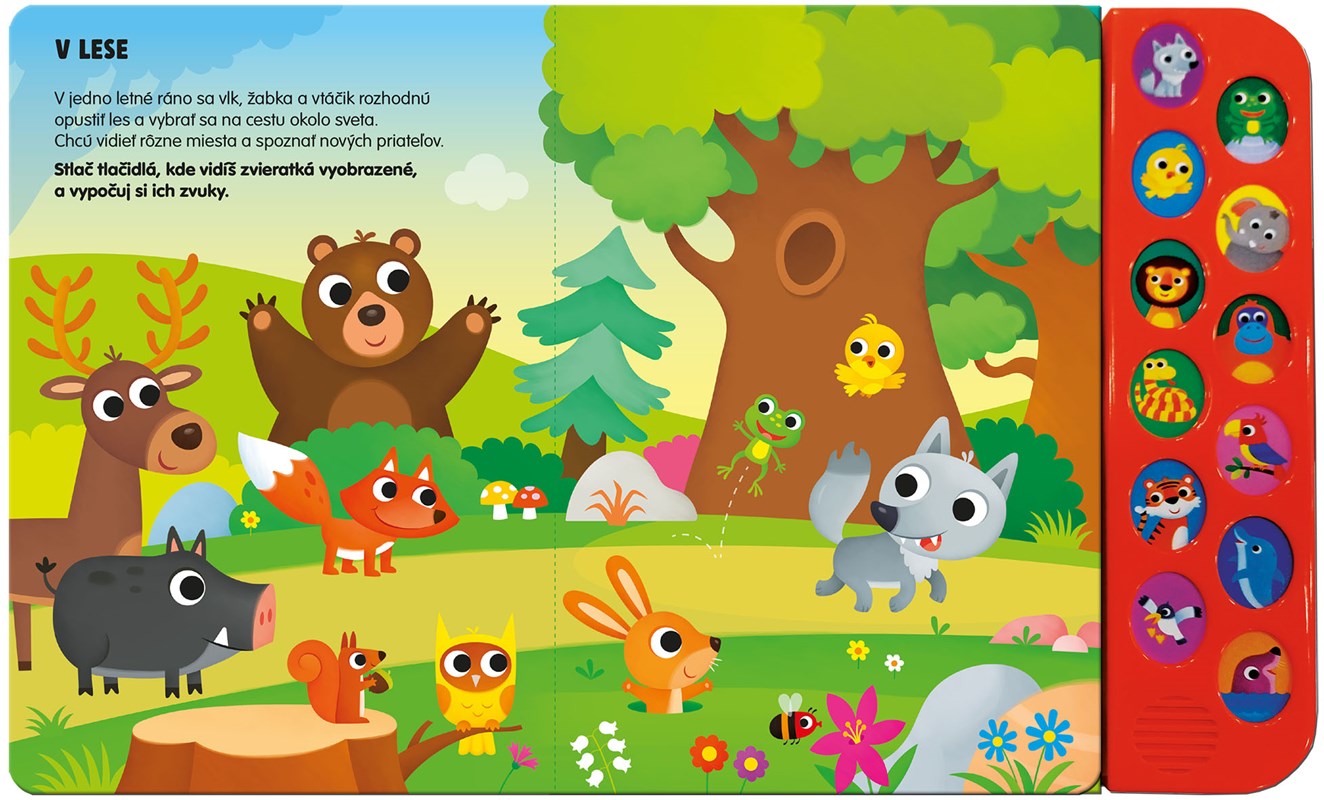 Poď so zvieratkami na výlet! V tejto zábavnej zvukovej knižke ťa čakajú vlk, žabka, vtáčik, slon, lev, gorila, had, papagáj, tiger, delfín, čajka a tuleň. Vďaka veselým obrázkom a jednoduchým textom si deti hravou formou rozvíjajú pozornosť, sluch aj slovnú zásobu. Zisti, kde zvieratká žijú, a hádaj, aký zvuk vydávajú! Knižka je navrhnutá tak, aby podporovala pozorovacie schopnosti a sluchové vnímanie detí, čím sa stáva zábavným a vzdelávacím nástrojom pre najmenších. Je ideálnym spoločníkom pre deti od 3 rokov, ktoré sa chcú naučiť viac o zvieratkách a ich zvukoch. Objavovanie ešte nikdy nebolo také zábavné!