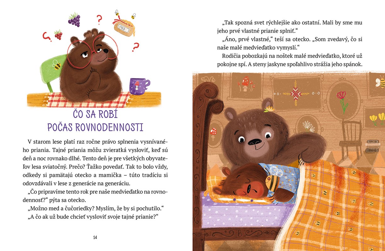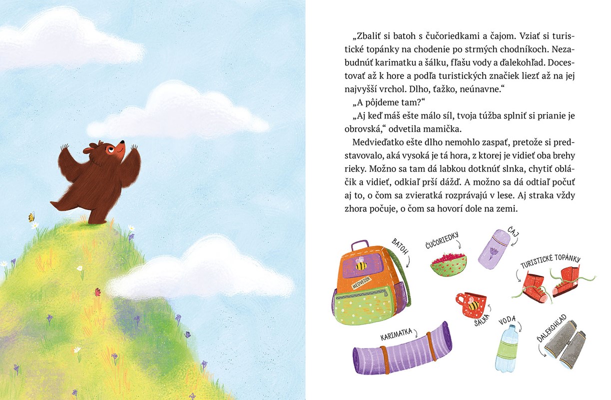 Odvážne medvieďatko sa vyberie na cestu splnenia si svojho tajného priania – chce sa dostať na najvyšší vrchol hory. Odtiaľ by malo na svoj domov krásny výhľad. Podarí sa mu prekonať vyčerpávajúcu cestu a nezľakne sa tajomných očí, ktoré ho noc čo noc pozorne sledujú? Vďaka láskavosti a srdečnosti si medvieďatko detičky zamilujú. Prostredníctvom jednoduchého a láskavého rozprávania sa naučia, aké dôležité sú hodnoty a vlastnosti ako priateľstvo, odvaha a rešpekt k prírode. Táto kniha je ideálna na spoločné čítanie s rodičmi alebo ako prvé samostatné čítanie pre malých objaviteľov. Na konci knižky sa totiž nachádza slovníček na rozšírenie slovnej zásoby a vedomostí.