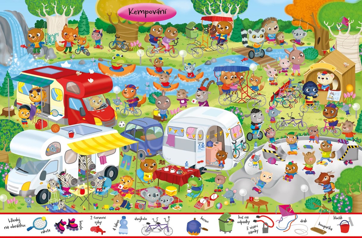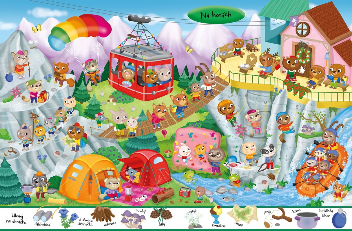 Zábavná kniha plná postav a předmětů, které je třeba hledat. Co se děje na horách, na sněhu, u moře, ve strašidelném domě, v zábavním parku, během kempování, v muzeu, v divadle a doma? Na konci knihy se nacházejí odpovědi hledaných předmětů. Knížka kromě 90 nálepek také obsahuje veselé obrázky pro vymalování.