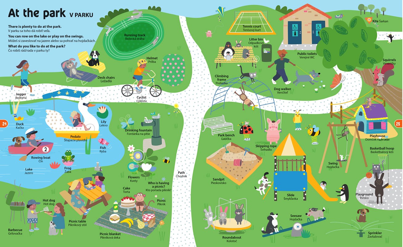 Kniha rozvíja jazykové schopnosti dieťaťa. Obsahuje hru - malí čitatelia musia nájsť šteniatko menom Toby na každej strane a naskenovať ho smartfónom alebo tabletom. Následne sa im spustí na smart zariadení stránka so všetkými slovíčkami, na ktoré môžu ťuknúť a vypočuť si ich správnu výslovnosť. Kniha obsahuje až 30 rozličných tém (rodina, bývanie, škola, mesto, zvieratá, povolania, ročné obdobia a počasie, športy, farby a tvary, čísla a čas, pocity, slová z rozprávok...).