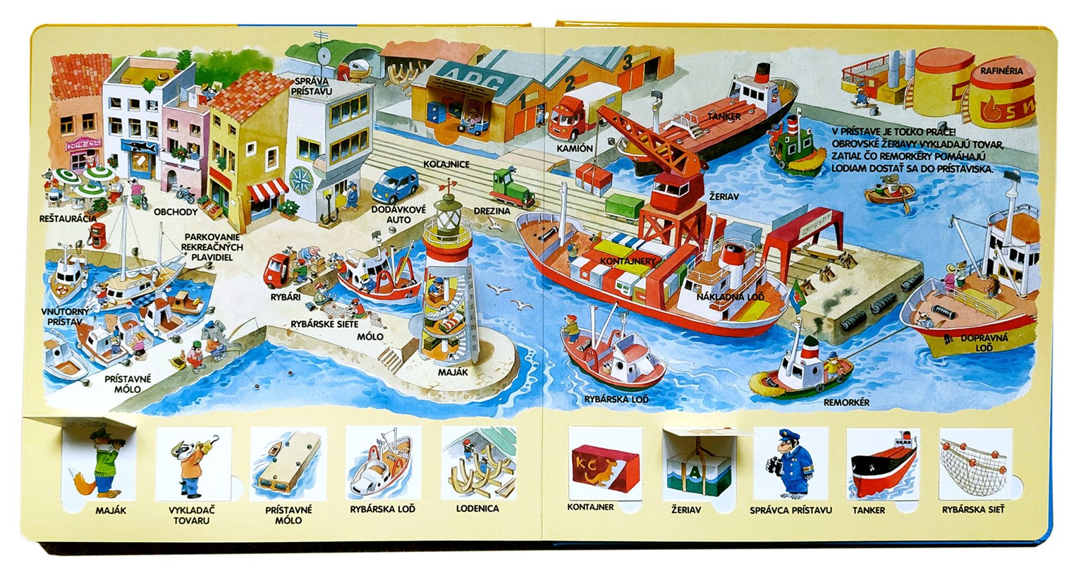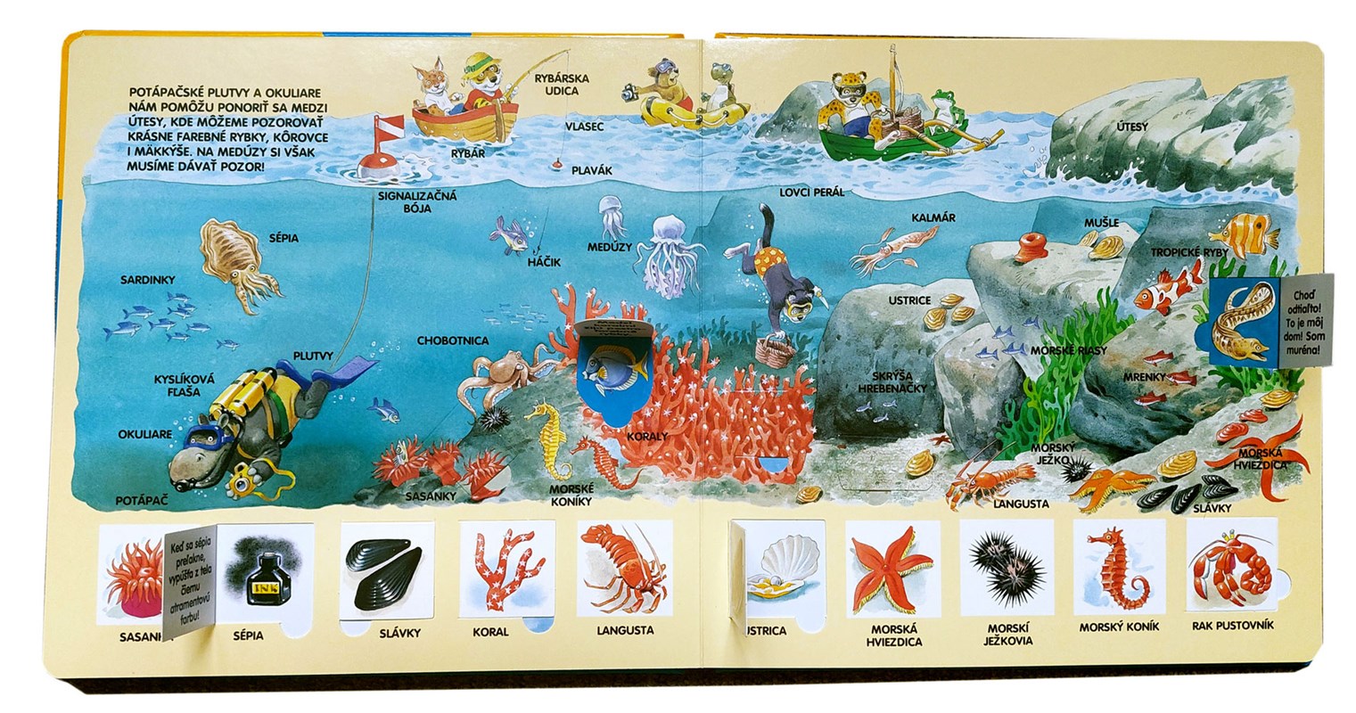 Skočíme spolu do vĺn, poprechádzame sa po pláži alebo po nábreží prístavu a nakoniec sa vydáme na plavbu na obrovskej lodi! O tom, čo sa deje na brehu i na mori, sa dozvieš, keď nazrieš do okienok. Zistíš, kto sa opaľuje na pláži, kto stavia hrady z piesku, kto pláva medzi koralmi, kto sa potápa do priezračných hlbín i kto kontroluje lode, ktoré vchádzajú do prístavu.