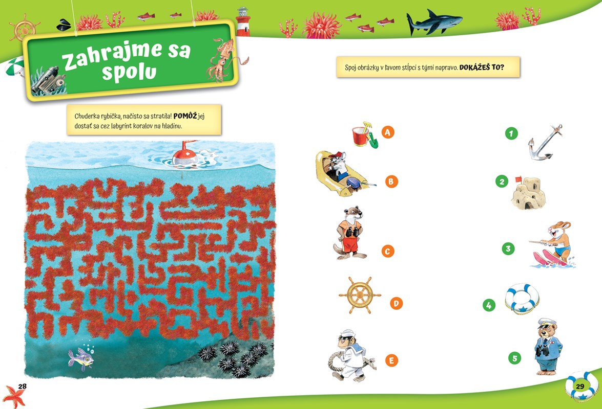 Na palubu, vyrážame! Poďte s nami preskúmať čarovné more, pieskové pláže, ohromné koralové útesy, ich priateľských obyvateľov a tajomné morské zákutia! Otvorte knižku a vydajte sa na plavbu s príbehmi, hrami, znovu použiteľnými nálepkami a inými veselými aktivitami. Prechádzajte sa prístavom, hľaďte na žblnkotajúce vlnky a kochajte sa pozorovaním koralových útesov.