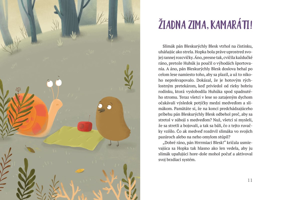 Zázrak padajúcich snehových vločiek je príbeh o bystrom mláďati škovránka, rýchlom slimákovi s ulitou plnou kníh a sove-vegetariánke. Spolu zachránia les a postarajú sa o to, aby do lesa opäť zavítala zima. Za týmto nádherným príbehom o zázraku, napísanom podmanivým jazykom a zručne ilustrovanom, sa skrýva nesmierne dôležité ponaučenie o skutočnom priateľstve a tolerancii. Hopka deti naučí, že vzhľad je často klamlivý a že je dôležité starať sa o životné prostredie.