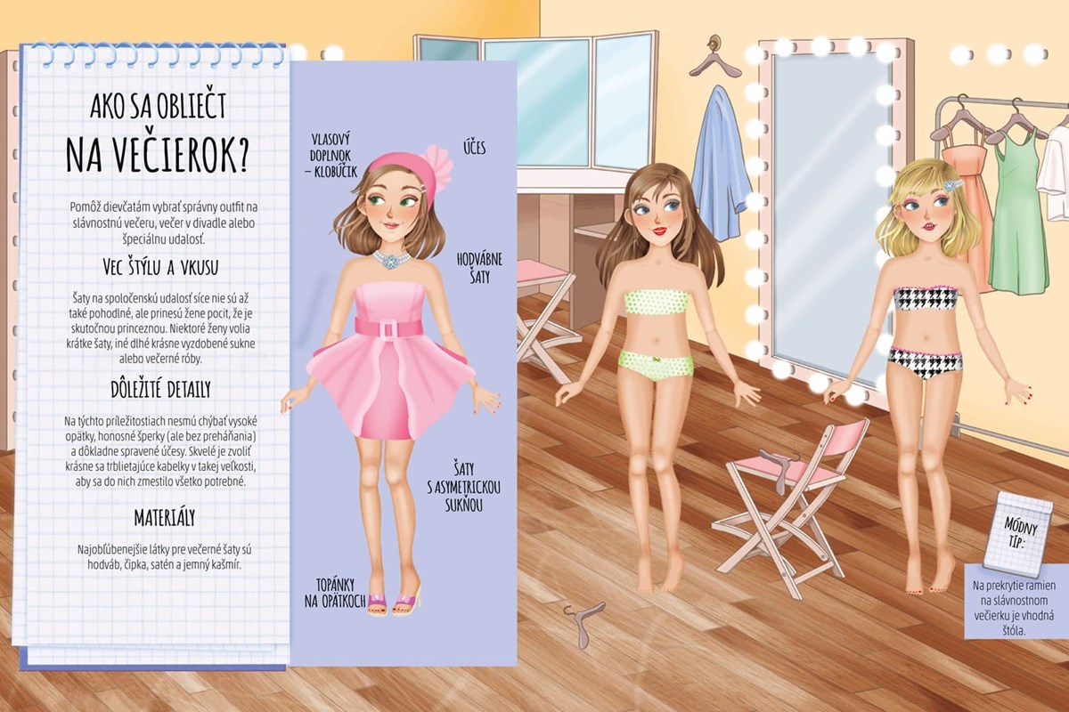 Popoludnie s kamarátkami, príjemná prechádzka a veľa výkladov s krásnym oblečením - to sú skvelé ingrediencie na nákupy! Ale aké najvhodnejšie oblečenie zvoliť? Šaty na spoločenskú udalosť síce nie sú až také pohodlné, ale prinesú dievčaťu pocit, že je skutočnou princeznou. Niektoré dievčatá volia krátke šaty, iné dlhé krásne vyzdobené sukne alebo večerné róby. Pomôž dievčatám vybrať správny outfit na slávnostnú večeru, večer v divadle alebo špeciálnu udalosť. Navrhni originálny outfit a zažiar ako módna návrhárka! Použi až 100 opakovane použiteľných nálepiek na vytvorenie množstva jedinečných módnych oblečení. Nauč sa názvy látok, odevov a doplnkov na rôzne príležitosti. Zaži veľa zábavy vytváraním módnych kúskov!