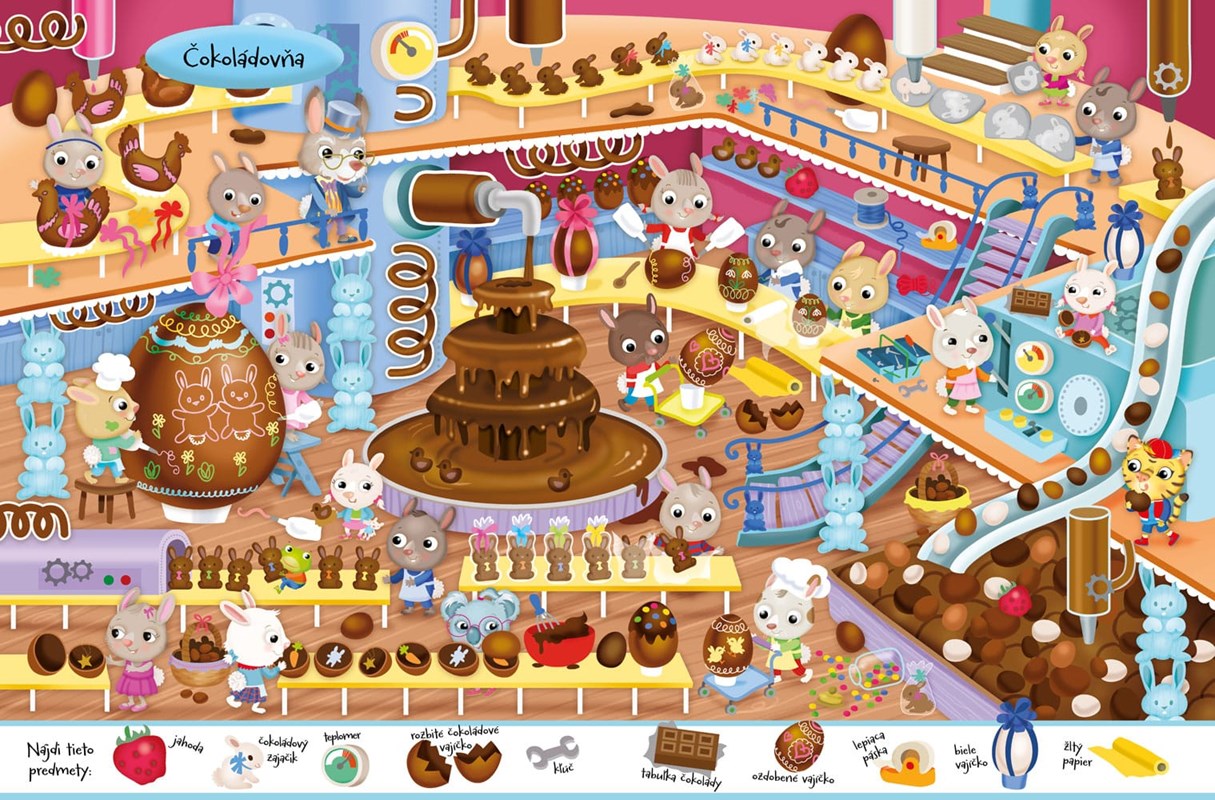 V jedno slnečné jarné ráno si koala Ela, tigrík Fred a žabiak Kvak-kvak našli v poštovej schránke netradičný list s dvoma bielymi ušami. Boli zvedaví, kto im píše. Po prečítaní listu zistili, že ich veľkonočný zajac pozýva na návštevu do Zajačej krajiny. Kamaráti sa veľmi potešili, neváhali a vyrazili na cestu. Pridaj sa k nim a otáčajúc stranu po strane hľadaj a nájdi rôzne predmety z obrázkov čokoládovne, výrobne cukríkov či zo záhrady veľkonočného zajaca. Zároveň hľadaj na každej dvojstrane troch roztomilých hlavných hrdinov.