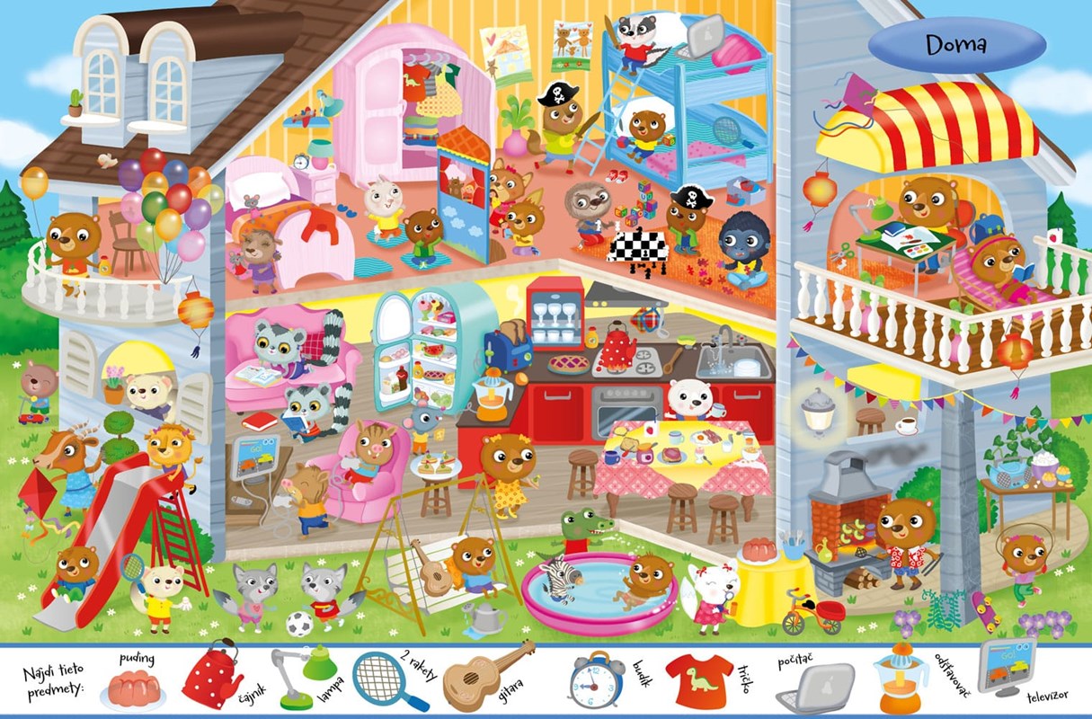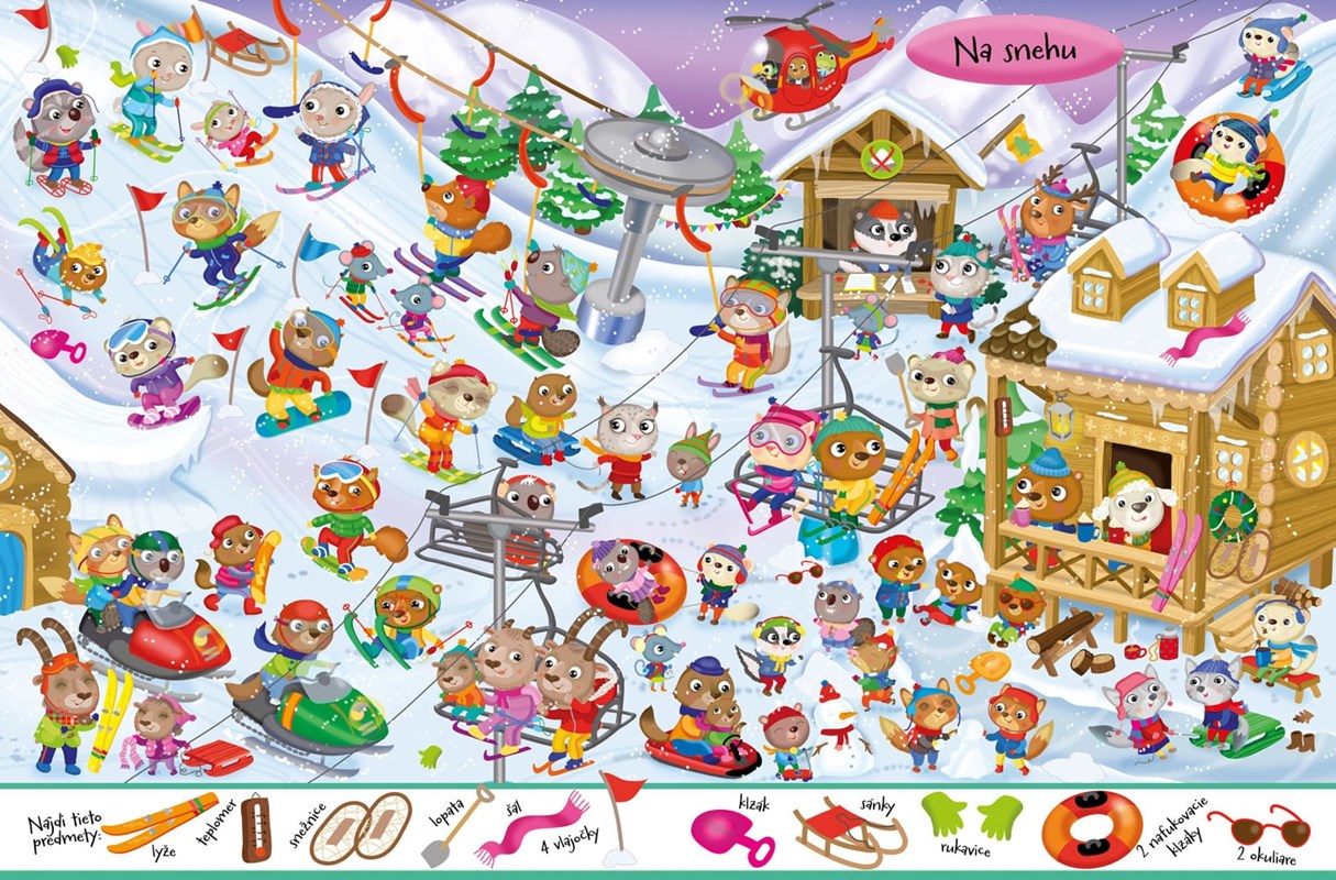 Zábavná kniha plná postáv a predmetov, ktoré treba hľadať. Čo sa deje na horách, na snehu, pri mori, v strašidelnom dome, zábavnom parku, múzeu, počas kempovania, divadle a doma? Na konci knihy sa nachádzajú odpovede hľadaných predmetov. Knižka okrem 90 nálepiek tiež obsahuje veselé obrázky na vymaľovanie.
