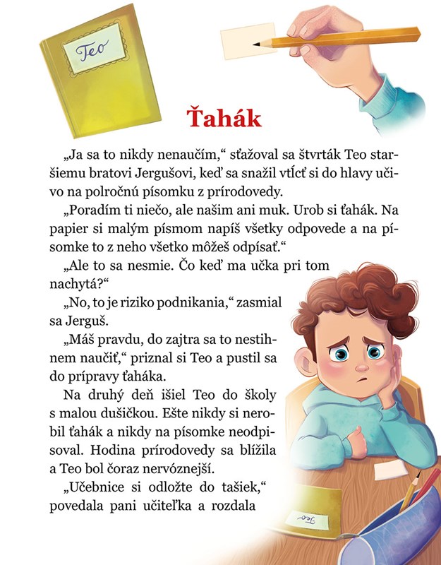 „Holá, holá, škola volá,“ opakuje dookola školský zvonec skoro zrána. Otvára sa školská brána, po letných prázdninách si žiaci vykladajú na lavice zošity a učebnice, peračníky aj desiate, začína sa nový školský rok. A okno na prváckej triede sa už nevie dočkať malých zvedavých prváčikov. Prečítajte si milé príbehy, veselé básničky i hádanky zo školského prostredia. Nakuknite do prváckej triedy na hodiny slovenského jazyka, matematiky, či prvouky a zistite, že kto do školy nechodí, ten sám sebe uškodí.