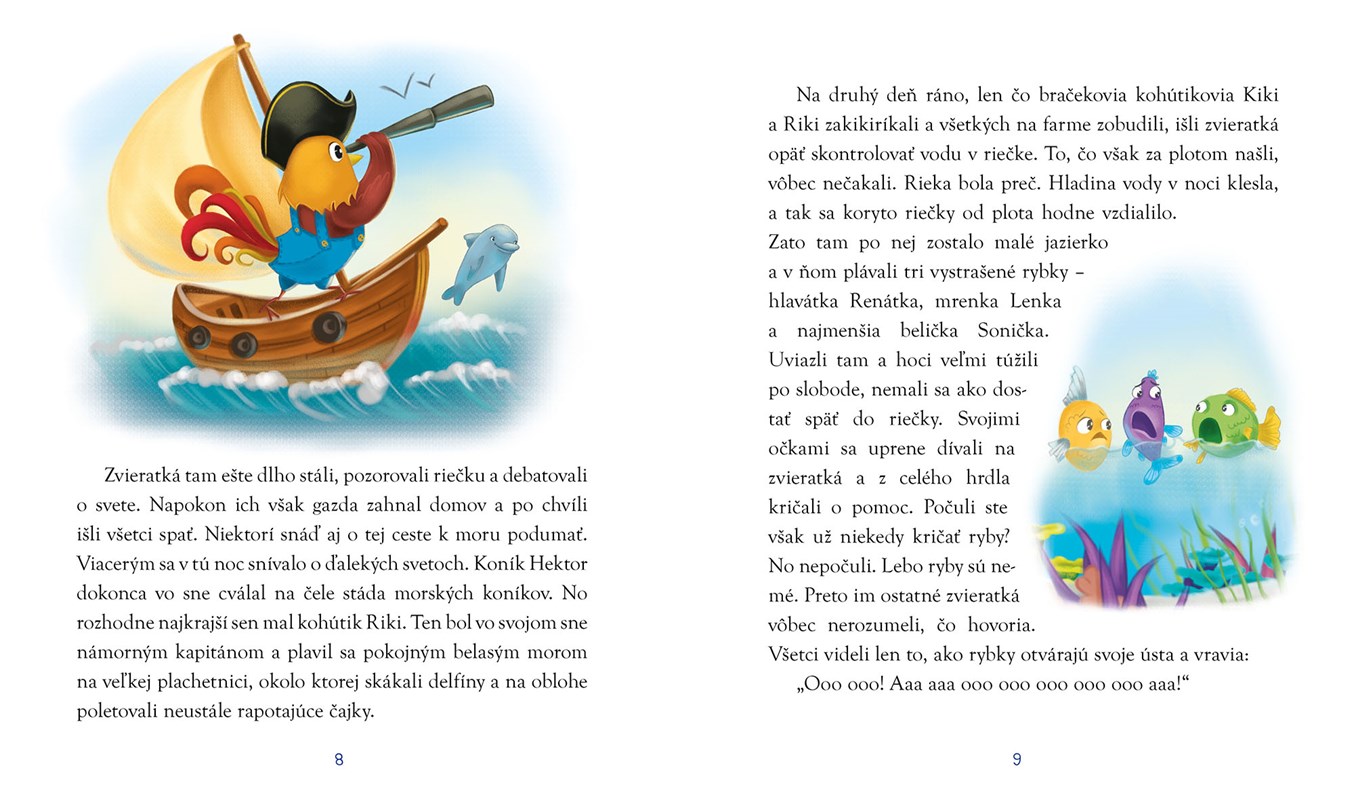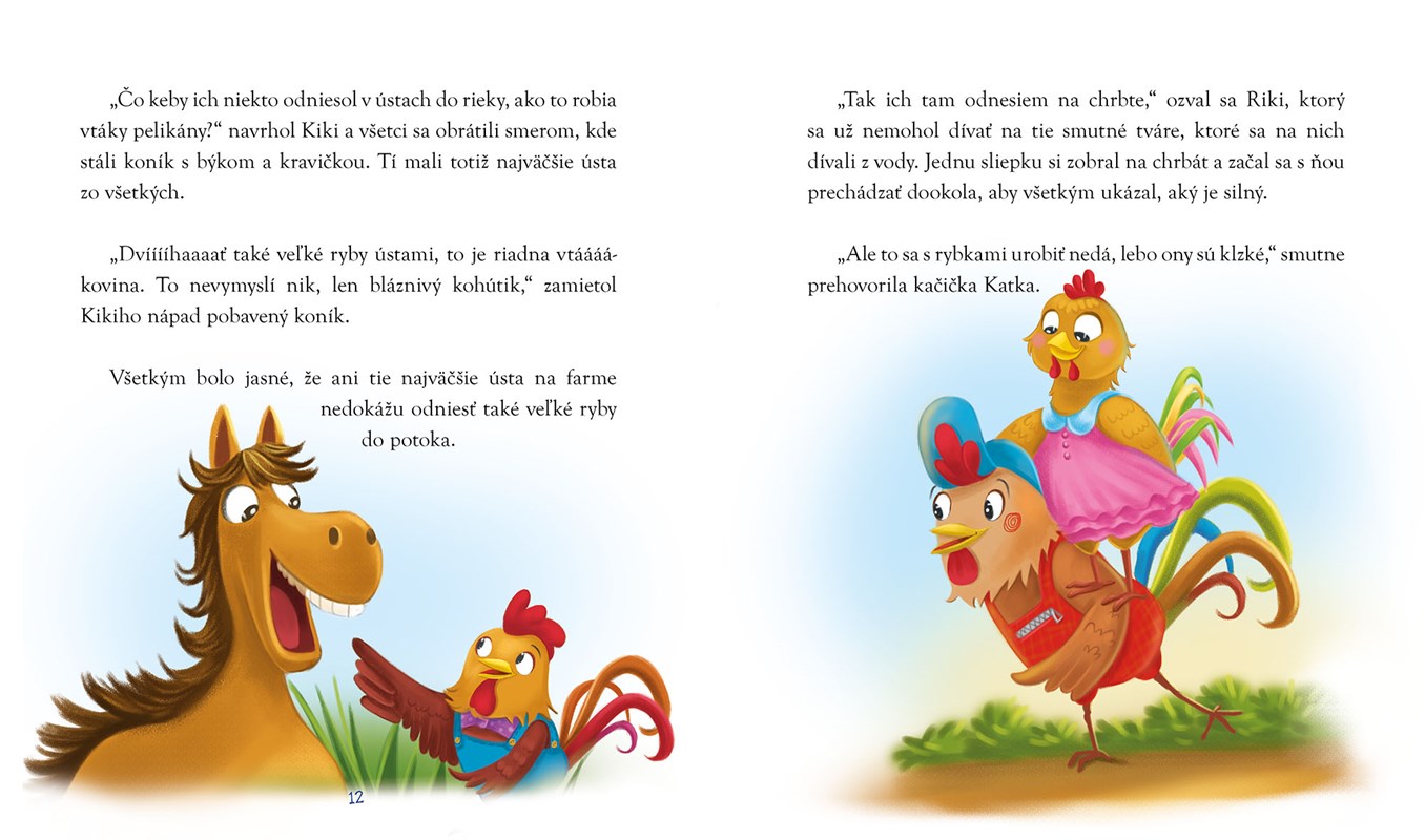 Knižka pre malých čitateľov s krásnymi ilustráciami o dvoch kohútích bračekoch. Kiki, ten najmúdrejší, a Riki, ten najodvážnejší tvor na farme, zažívajú rôzne veselé príhody, s nimi je vždy zábava! Prečítajte si o veselých zvieracích dobrodružstvách – o rybičkách, ktoré zablatili celú farmu, aj keď pritom na farme vôbec nikdy neboli, o oslobodení páva Emila zo ZOO a tiež o tom, ako kohútí bračekovia prekabátili prefíkanú líšku. Je to knižka o priateľstve s krásnou myšlienkou – vždy ochote pomôcť tým, ktorí to potrebujú. Svojím konaním tak môžu inšpirovať deti, aby svoju vynaliezavosť a odvahu využili vtedy, keď je potrebné niekomu pomôcť.